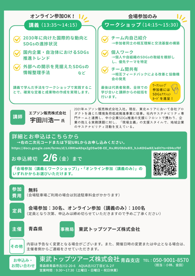 内容は、エプソン販売株式会社 宇田川浩一氏による講演のほか、SDGsの取組をより進めるための手法を学ぶワークショップを予定しており、SDGsの具体的なアクションにつなげるヒントを得られる場となっています。