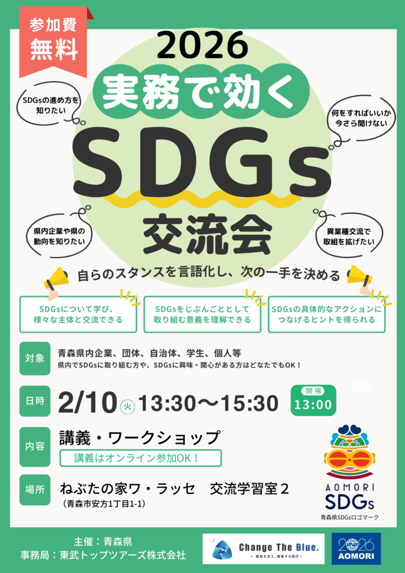 このたび、青森県で、企業、団体、自治体、学生など県民の皆様が幅広く参加できる交流会を開催することとしました。